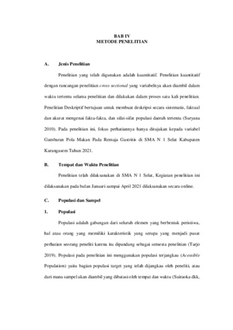 AN OVERVIEW OF DIET IN GASTRITIS TEENAGERS IN SMA N 1 SELAT KARANGASEM REGENCY IN 2021 ABSTRACT Gastritis is a growth in the mucous membrane marked with discomfort in the upper abdomen, nausea, vomiting, decreased appetite and headache. This disease is more popular called stomach disease. The occurrence of gastritis is due to a free diet that affects the health of the body. The purpose of this research is to find out the patterns of eating in teenagers in at SMA N 1 Selat Karangasem Regency in 2021. This study uses quantitative methods with cross sectional research plans and research carried out in April. The population in this study uses the Acessible Population with 41 samples. The instrument used is a feeding pattern quantifier. The results of the study show that most juvenile eating patterns in poor categories with 32 responders (78%). In addition, most 18-year-olds responded with 29 responders (70.7%), of whom 33 responders (80.5%).It is recommended that the UKS and PMR teachers please give an explanation of eating patterns in adolescent gastritis. The conclusion is that irregular eating patterns can cause gastritis. Keywords: Diet, Teenagers, Gastritis