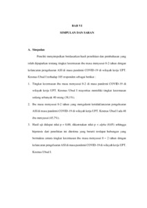 THE CORELLATION BETWEEN ANXIETY LEVEL OF BREASTFEEDING MOTHER DURING YEAR 0 UNTIL 2 WITH THE SMOOTH DELIVERY OF BREAST MILK DURING COVID-19 PANDEMIC IN UPT. KESMAS UBUD I ABSTRACT Feelings of anxiety can have an effect on the release of milk which causes the milk to come out late. The COVID-19 pandemic has caused high levels of anxiety among the Indonesian population which could affect the smooth flow of breastfeeding. The purpose of this study was to determine the relationship between the level of anxiety of mothers during 0-2 years of breastfeeding with the smooth delivery of breast milk during the COVID-19 pandemic in the UPT. Kesmas Ubud I uses a correlational research design that aims to reveal correlative relationships between variables with a cross-sectional approach. Sampling using nonprobability sampling with purposive sampling technique. The sample size used in the study was 105 samples. The results showed that the majority of breastfeeding mothers had a moderate level of anxiety as many as 40 people (38.1%), 48 people (45.7%) experienced unsuccessful breastfeeding, and p = 0.00 < alpha (0.05) The hypothesis of this study is accepted, which means that there is a significant relationship between the level of anxiety of mothers during breastfeeding 0–2 years with the smooth release of breast milk during the COVID-19 pandemic in the UPT. Kesmas Ubud I. Researchers hope there will be a health service program related to efforts to deal with the impact of the COVID-19 pandemic on people's mental health. Keywords: level of anxiety, breastfeeding mothers, expenditure of breastmilk