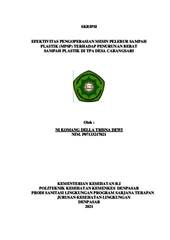 Della Trisna Dewi, Ni Komang and Suarta Asmara, BE,SST.,M.Si, I Wayan and Jana, S.KM., M.Si, I Wayan (2021) EVEKTIVITAS PENGOPERASIAN MESIN PELEBUR SAMPAH PLASTIK (MPSP) TERHADAP PENURUNAN BERAT SAMPAH PLASTIK DI TPA DESA CARANGSARI. Diploma thesis, Jurusan Kesehatan Lingkungan.