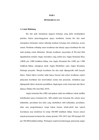 MIDWIFERY CARE FOR MOTHER “PA” 23 YEARS OLD PRIMIGRAVIDAFORM 29 WEEKS SIX DAYS OF P REGNANCY UNTIL 42 DAYS POSY PASRTUM Cace studies were conducted in the working area of the Health center ini Negara ABSTRACT Maternal mortality rate (MMR) is an indicator to see the success of public health status. Midwives as providers of midwifery care have a strategic position to play a role in efforts to reduce MMR and IMR. In carrying out midwifery practices, midwives have the authority to provide maternal health services, child health services, and women's reproductive health services and family planning. This final project report aims to explain the application of midwifery care to “PA” mothers aged 23 years from 29 weeks of gestation 6 days to 42 days of the postpartum period. The results of midwifery care take place physiologically, this can be seen from a healthy pregnancy period, the problems experienced by mothers during pregnancy are within physiological limits. Good fetal well-being is characterized by a normal heart rate and active movement. Mothers give birth at 40 weeks of gestation through normal delivery. The puerperal condition includes the involution process running well, lochea excretion within normal limits and the lactation process running smoothly. The baby "PA" mother was born with a healthy condition, active movement and strong crying. This final project report is expected to provide an overview and information about the implementation of sustainable midwifery care so that it can help maternal and child health programs. Keywords : Pregnancy, Childbirht, Postpartum, Babies.