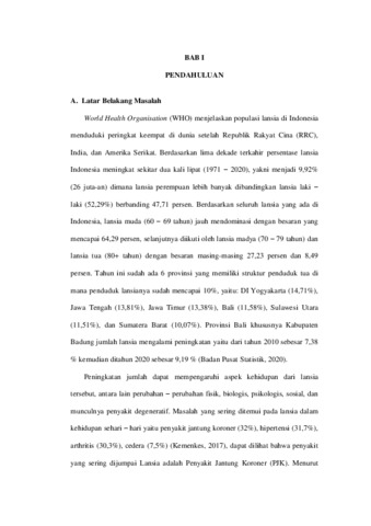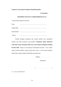 THE DESCRIPTION OF TOTAL CHOLESTEROL LEVELS IN THE ELDERLY AT BANJAR PANDE, MENGWI TRADITIONAL VILLAGE, BADUNG REGENCY, BALI PROVINCE ABSTRACT Most coronary heart disease in the elderly is caused by an increase in cholesterol levels. The aim of this study was to describe the Total Cholesterol level in the elderly Banjar Pande, Desa Adat Mengwi, Badung Regency, Bali Province. This research method is a descriptive study conducted in January - April 2021 with a total of 27 respondents obtained by purposive sampling technique. Total cholesterol levels were measured by the Point Of Care Testing (POCT) method. The results showed that of the 27 respondents (59.3%) had normal Total Cholesterol levels, (37%) threshold Total Cholesterol levels, and (3.7%) high Total Cholesterol levels. Total abnormal cholesterol is more common in the age range 71-75 years and is mostly experienced by elderly women (22.2%). Based on the consumption of fatty foods, (51.9%) the elderly rarely eat fatty foods and (37%) the elderly who have abnormal total cholesterol levels and are included in the category of frequently consuming fatty foods. The conclusion of this study is that most of the elderly have normal Total Cholesterol levels. Abnormal total cholesterol levels are more common in the age range 71 - 74 years and are more common in elderly women and 37% of the elderly, including frequently consuming fatty foods, have abnormal levels of Total Cholesterol. Key words: Elderly, Total Cholesterol, POCT method