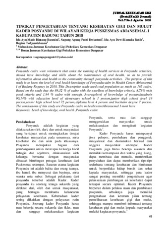 Ida Ayu Made, Bintang Rusmin and Putri Dwiastuti, Sagung Agung and Ratih, Ida Ayu Dewi Kumala and Regina, Tedjasulaksana (2020) TINGKAT PENGETAHUAN TENTANG KESEHATAN GIGI DAN MULUT KADER POSYANDU DI WILAYAH KERJA PUSKESMAS ABIANSEMAL I KABUPATEN BADUNG TAHUN 2018. Jurnal Kesehatan Gigi (Dental Health Journal), 7 (2). ISSN 2337-4187