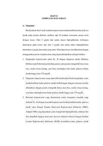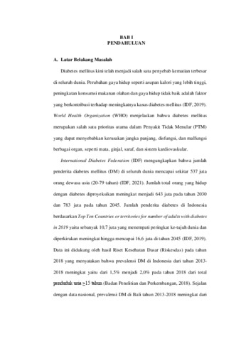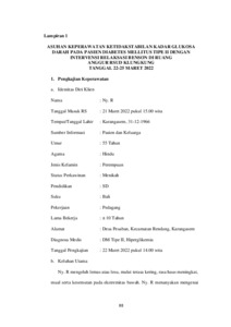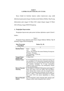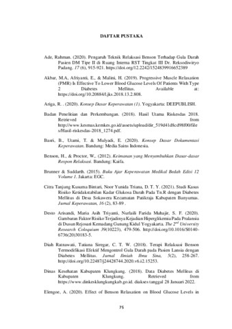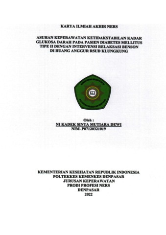 NURSING CARE OF INSTABILITY BLOOD GLUCOSE LEVELS IN TYPE II DIABETES MELLITUS PATIENTS WITH BENSON RELAXATION INTERVENTION IN THE WINE ROOM OF KLUNGKUNG HOSPITAL ABSTRACT The number of diabetes mellitus cases in inpatients at the Klungkung District Hospital in 2021 was 652 people and was dominated by type II diabetes mellitus sufferers. The purpose of this study was to determine nursing care of instability blood glucose levels in type II diabetes mellitus patients with benson relaxation intervention in the wine room of rsud klungkung. The results of the study found nursing assessment data for patients complaining of weakness or lethargy, dry mouth, increased thirst and blood levels of High blood glucose is 374 mg/dL. The nursing diagnosis formulated is the instability of blood glucose levels associated with insulin resistance. The nursing plan refers to the guidelines for the Indonesian Nursing Outcome Standard (SLKI) with the outcome of stable blood glucose levels increasing and the Indonesian Nursing Intervention Standard (SIKI) with the main intervention of hyperglycemia management, dietary education support interventions, as well as innovative interventions for Benson relaxation therapy given 3 times a day for 10 days. -15 minutes. Nursing implementation is carried out according to the planned nursing plan for 3x24 hours. The nursing evaluation showed that the goal was achieved as evidenced by decreased weakness or lethargy, the mouth felt moist, thirst decreased and blood glucose levels improved, namely 184 mg/dL. Benson relaxation therapy can be an intervention used to treat the problem of unstable blood glucose levels in patients with type II diabetes mellitus. Keywords: Type II Diabetes Mellitus, Unstable Blood Glucose Levels, Benson Relaxation Therapy ASUHAN KEPERAWATAN KETIDAKSTABILAN KADAR GLUKOSA DARAH PADA PASIEN DIABETES MELLITUS TIPE II DENGAN INTERVENSI RELAKSASI BENSON DI RUANG ANGGUR RSUD KLUNGKUNG ABSTRAK Angka kasus diabetes mellitus pada pasienrawatinapdi RSUD Klungkungtahun 2021 sebanyak 652 jiwadan didominasi oleh penderita diabetes mellitus tipe II. Tujuan dari penelitian ini adalah untuk mengetahui asuhan keperawatan ketidakstabilan kadar glukosa darah pada pasien diabetes mellitus tipe II dengan intervensi relaksasi benson di ruang anggur rsud klungkung. Hasil penelitian menemukan data pengkajian keperawatan pasien mengeluh lemas atau lesu, mulut terasa kering, rasa haus meningkat dan kadar glukosa dalam darah tinggi yaitu 374 mg/dL. Diagnosis keperawatan yang dirumuskan adalah ketidakstabilan kadar glukosa darah berhubungan dengan resistensi insulin. Rencana keperawatan mengacu pada pedoman Standar Luaran Keperawatan Indonesia (SLKI) dengan luaran kestabilan kadar glukosa darah meningkat dan Standar Intervensi Keperawatan Indonesia (SIKI) dengan intervensi utama manajemen hiperglikemia, intervensi pendukung edukasi diet, serta intervensi inovatif terapi relaksasi benson diberikan 3 kali sehari selama 10-15 menit. Implementasi keperawatan dilakukan sesuai dengan rencana keperawatan yang sudah direncanakan selama 3x24 jam. Evaluasi keperawatan menunjukkan tujuan tercapai dibuktikan dengan lemas atau lesu menurun, mulut terasa lembab, rasa haus menurun dan kadar glukosa darah membaik yaitu 184 mg/dL. Terapi relaksasi benson dapat menjadi intervensi yang digunakan untuk menangani masalah ketidakstabilan kadar glukosa darah pada pasien diabetes mellitus tipe II. Kata Kunci : Diabetes Mellitus Tipe II, Ketidakstabilan Kadar Glukosa Darah, TerapiRelaksasi Benson