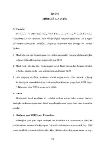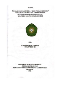 THE EFFECT OF ANIMATION VIDEO MEDIA EDUCATION ON STUDENT PREPAREDNESS IN FACING EARTHQUAKE DISASTER IN SD NEGERI 2 BEBANDEM KARANGASEM IN 2022 ABSTRACT Disaster is an event that threatens human life, both having an impact on children and adults including all ages. Efforts that can be made to reduce this impact are by providing animated video media education. The purpose of this study was to determine the effect of providing education using media animated video on the preparedness of elementary school children in dealing with earthquake disasters. This type of research is a Pre Experimental design where the design used is One-Group pre-post design using simple random sampling. The number of samples is 30 people who are class IV and V. . The results of this study show that children's preparedness in primary schools before being given animation video media education was in the ready category, only 6 people (20%) and after being given animated video media education showed an increase in preparedness knowledge with the results 29 people (97%) were in the category ready to arrive The results of this study were tested with a paired t-test statistical test, the results obtained p-value = 0.000< alpha (0.05), it can be concluded that there is an effect of using animated video media on earthquake disaster preparedness in elementary school. Based on this research, it is recommended for teachers in schools to increase the provision of disaster preparedness materials by developing other similar educational media. Keywords : Earthquake Disaster,Preparedness,Animated Video Media Education. PENGARUH EDUKASI MEDIA VIDEO ANIMASI TERHADAP KESIAPSIAGAAN SISWA DALAM MENGHADAPI BENCANA GEMPA BUMI DI SD NEGERI 2 BEBANDEM KARANGASEM TAHUN 2022 ABSTRAK Bencana merupakan suatu peristiwa yang mengancam jiwa manusia,baik berdampak pada anak-anak maupun orang dewasa termasuk semua usia.Upaya yang bisa dilakukan untuk mengurangi dampak tersebuat adalah dengan memberikan edukasi medi video animasi .Tujuan penelitian ini adalah untuk mengetahui pengaruh pemberian edukasi dengan menggunakan media video animasi terhadap kesiapsiagaan anak sekolah dasar dalam mengahdapi bencana gempa bumi.Jenis penelitian ini adalah Pre Experimental design dimana rancangan yang digunakan yaitu One -Grup pre-post design menggunakan simple random sampling.Jumlah sampel sebanyak 30 orang yang merupakan kelas IV dan V.Dengan hasil penelitian ini menunjukan kesiapsiagaan anak di sekoalah dasar sebelum diberikan edukasi media video animasi berada pada rata- rata 52.40 dan setelah diberiakn media video animasi menunjukkan nilai rata-rata 82.00 .Hasil penelitian ini diuji dengan uji statistic paired t-test ,didapatkan hasil nilai p-value = 0,000 < alpha (0,05),maka dapat disimpulkan bahwa ada pengaruh penggunaan media video animasi terhadap kesiapasiagaan bencana gempa bumi di SD Negeri 2 Bebandem Karangasem.Berdasarkan penelitian ini maka disarankan kepada guru disekolah untuk meningkatakan pemberian materi kesiapsigaan kebencanaan dengan mengembangkan media edukasi lainnya yang serupa. Kata Kunci : Bencana Gempa Bumi,Kesiapsiagaan,Edukasi Media Video Animasi