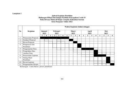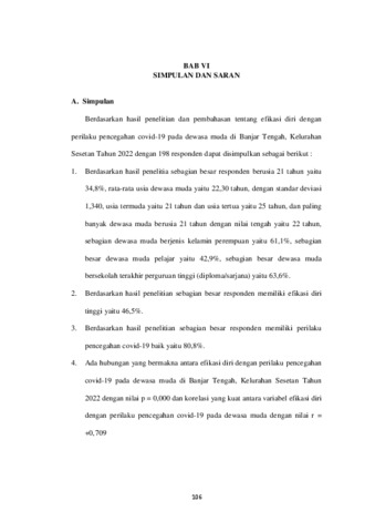 THE RELATION OF SELF-EFFICIENCY TOWARDS COVID-19 PREVENTION BEHAVIOR ON YOUNG ADULTS IN BANJAR TENGAH SESETAN VILLAGE ON 2022 ABSTRACT Covid-19 has recently caused the deaths of hundreds to millions of people, so it is necessary to take preventive measures against COVID-19. The way to prevent the occurrence of COVID-19 is to carry out COVID-19 preventive behavior. Self-efficacy is self-confidence in doing something, self-efficacy is needed to be able to carry out COVID-19 prevention behavior properly. This study aims to determine the relationship between self-efficacy and COVID-19 prevention behavior in young adults in Banjar Tengah, Kelurahan Sesetan in 2022. The type of research used was non-experimental with correlational type and cross sectional approach using non-probability sampling w ith purposive sampling. The total population is 391 people with a total sample of 198 people. The study was conducted in April 2022. Data collection used a self-efficacy questionnaire and COVID-19 prevention behavior. The results showed most of the young adults at the age of 21 years (34.8%), female gender (61.1%), students (42.9%), higher education (63.6%), high self-efficacy (46 , 5%), good covid-19 prevention behavior (80.8%). Hypothesis testing using the Spearman test with a value of p = 0.000 (α = 0.05) and a value of r = +0.709. Conclusion: there is a significant relationship between self-efficacy and COVID-19 prevention behavior in young adults in Banjar Tengah, Sesetan Village (p=0.000 and r=+0.709) with most of them having high self-efficacy with good preventive behavior, meaning the higher Young adult self-efficacy increases actions that help to prevent the spread of COVID-19. Suggestion: respondents in Banjar Tengah to increase self-efficacy of young adults by providing education related to covid-19 to other young adults who feel they have not been able to prevent covid-19 because the process of forming self-efficacy, one of which is knowledge can provide direction for appropriate actions. will be done. Key words : covid-19; preventive behavor; self efficacy HUBUNGAN EFIKASI DIRI DENGAN PERILAKU PENCEGAHAN COVID-19 PADA DEWASA MUDA DI BANJAR TENGAH KELURAHAN SESETAN TAHUN 2022 ABSTRAK Covid-19 baru-baru ini menyebabkan kematian ratusan hingga jutaan orang, sehingga perilaku pencegahan covid-19 perlu dilakukan. Cara untuk mencegah terjadinya covid-19 adalah dengan melakukan perilaku pencegahan covid-19. Efikasi diri merupakan keyakinan diri dalam melakukan sesuatu, efikasi diri yang tinggi diperlukan agar dapat melakukan perilaku pencegahan covid-19 dengan baik. Penelitian ini bertujuan untuk mengetahui hubungan efikasi diri dengan perilaku pencegahan covid-19 pada dewasa muda di Banjar Tengah, Kelurahan Sesetan Tahun 2022. Jenis penelitian yang digunakan adalah non-eksperimen dengan jenis korelasional dan pendekatan cross sectional menggunakan non probability sampling dengan purposive sampling. Jumlah populasi sebanyak 391 orang dengan jumlah sampel sebanyak 198 orang. Penelitian dilakukan pada bulan April tahun 2022. Pengumpulan data menggunakan kuesioner efikasi diri dan perilaku pencegahan covid-19. Hasil penelitian menunjukkan sebagian besar dewasa muda berusia 21 tahun (34,8%), jenis kelamin perempuan (61,1%), mahasiswa (42,9%), pendidikan tinggi (63,6%), efikasi diri tinggi (46,5%), perilaku pencegahan covid-19 baik (80,8%). Uji hipotesis menggunakan uji spearman dengan nilai p=0,000 (α=0,05) dan nilai r=+0,709. Simpulan : ada hubungan yang signifikan antara efikasi diri dengan perilaku pencegahan covid-19 pada dewasa muda di Banjar Tengah, Kelurahan Sesetan (p=0,000 dan r=+0,709) dengan sebagian besar yang memiliki efikasi diri tinggi dengan perilaku pencegahan baik, artinya semakin tinggi efikasi diri dewasa muda semakin baik tindakan yang dilakukannya untuk mencegah penyebaran covid-19. Saran : kepada responden di Banjar Tengah agar meningkatkan efikasi diri responden dengan memberikan edukasi terkait covid-19 kepada responden lainnya yang merasa belum mampu melakukan pencegahan covid-19 karena proses terbentuknya efikasi diri salah satunya dari pengetahuan sehingga dapat memberi arahan bagi tindakan yang akan dilakukan. Kata kunci : covid-19; perilaku pencegahan; efikasi diri