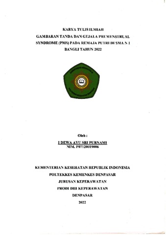 Purnami, I Dewa Ayu Sri (2022) GAMBARAN TANDA DAN GEJALA PREMENSTRUAL SYNDROME (PMS) PADA REMAJA PUTRI DI SMA N 1 BANGLI TAHUN 2022. Diploma thesis, Poltekkes Kemenkes Denpasar Jurusan Keperawatan 2022.