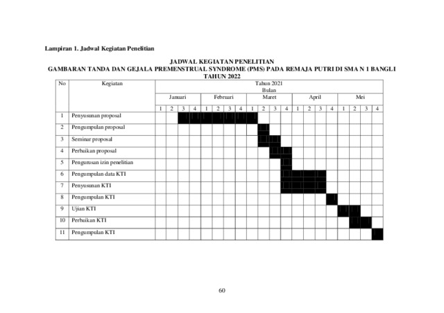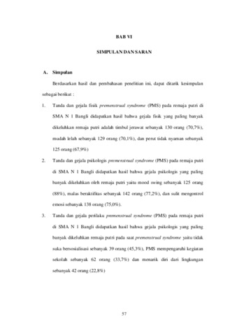 DESCRIPTION OF SIGNS AND SYMPTOMS PREMENSTRUAL SYNDROME (PMS) IN YOUNG WOMEN AT SMA N 1 BANGLI IN 2022 Premenstrual syndrome is a collection of complaints that lasts three to one week before the onset of menstruation. Various symptoms arise during premenstrual syndrome such as physical symptoms, psychological symptoms, and behavioral symptoms, the symptoms that arise can have an impact on the interpersonal relationships of young women. The purpose of this study was to describe the signs and symptoms of premenstrual syndrome (PMS) in adolescent girls at SMA N 1 Bangli in 2022. The type of research used was descriptive with a cross sectional approach. The sampling method is using probability sampling with the stratified random sampling method. data collection in this study using a questionnaire sheet. This research was conducted in April with a total sample of 184 respondents. The results of this study indicate that the physical symptoms of premenstrual syndrome that most young women complain about are acne as many as 130 people (70.7%), the psychological symptoms of premenstrual syndrome that are most complained of by young women are mood swings as many as 155 people (84, 2%), and the behavioral symptoms of premenstrual syndrome that most young women complain about are not liking to socialize as many as 80 people (43.5%). Keywords: Signs, Symptoms, PMS, Young Women GAMBARAN TANDA DAN GEJALA PREMENSTRUAL SYNDROME (PMS) PADA REMAJA PUTRI DI SMA N 1 BANGLI TAHUN 2022 Premenstruasi syndrome merupakan kumpulan keluhan yang berlangsung tiga sampai satu minggu sebelum terjadinya menstruasi. Berbagai gejala timbul pada saat premenstrual syndrome seperti gejala fisik, gejala psikologis, dan gejala perilaku, gejala yang timbul dapat berdampak kepada hubungan interpersonal remaja putri. Tujuan dari penelitian ini yaitu mengetahui gambaran tanda dan gejala premenstrual syndrome (PMS) pada remaja putri Di SMA N 1 Bangli tahun 2022. Jenis penelitianyang digunakan adalah deskriptif dengan pendekatan cross sectional. Cara pengambilan sampel dengan menggunakan probability sampling dengan metode stratified random sampling.pengambilan data dalam penelitian ini menggunakan lembar kuesioner. Penelitian ini dilakukan pada bulan April dengan jumlah sampel sebanyak 184 responden. Hasil dari penelitian ini menunjukan bahwa gejala fisik premenstrual syndrome yang paling banyak dikeluhkan oleh remaja putri yaitu timbul jerawat sebanyak 130 orang (70,7%), gejala psikologis premenstrual syndrome yang paling banyak dikeluhkan oleh remaja putri yaitu mood swing sebanyak 155 orang (84,2%), dan gejala perilaku premenstrual syndrome yang paling banyak dikeluhkan oleh remaja putri yaitu tidak suka bersosialisasi sebanyak 80 orang (43,5%). Kata Kunci : Tanda, Gejala, PMS, Remaja Putri