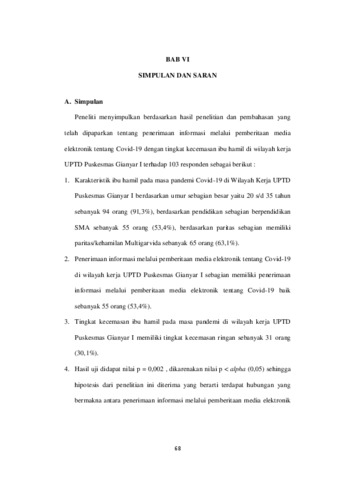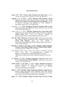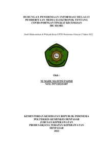 RELATIONSHIP RECEIVING INFORMATION THROUGH ELECTRONIC MEDIA PREACHING ABOUT COVID-19 WITH ANXIETY LEVEL OF PREGNANT MOTHERS ABSTRACT Corona Virus Disease (COVID-19) is a disease caused by the Severe Acute Respiratory Syndrome Coronavirus-2 (SARS-Cov-2). The high risk of contracting Covid-19 is one of them in pregnant women. The purpose of this study was to determine the relationship between receiving information through electronic media reporting about Covid-19 with the level of anxiety of pregnant women in the UPTD Puskesmas Gianyar I Work Area. This type of research was quantitative analytic correlation with a cross sectional using a total sampling technique. The number of samples in this study were 103 pregnant women according to the inclusion criteria. Statistical testing using the Spearman rank. The characteristics of pregnant women during the Covid-19 pandemic in the UPTD Gianyar I Health Center Work Area were mostly pregnant women aged 20 to 35 years as many as 94 people (91.3%), pregnant women with high school education as many as 55 people (53.4%). and pregnant women had multigravida pregnancies as many as 65 people (63.1%). Most of the information received through electronic media coverage was good, as many as 55 people (53.4%). The anxiety level of pregnant women mostly had a mild level of anxiety as many as 31 people (30.1%). Receipt of information through electronic media reporting about Covid-19 and the level of anxiety of pregnant women were significantly related to the value of p = 0.002 (p<0.05). Keywords : Covid-19, anxiety level, media coverage HUBUNGAN PENERIMAAN INFORMASI MELALUI PEMBERITAAN MEDIA ELEKTRONIK TENTANG COVID-19 DENGAN TINGKAT KECEMASAN IBU HAMIL ABSTRAK Corona Virus Disease (COVID-19) merupakan penyakit yang disebabkan oleh virus Severe Acute Respiratory Syndrome Coronavirus-2 (SARS-Cov-2). Risiko tinggi tertular Covid-19 salah satunya pada ibu hamil. Tujuan dari penelitian ini untuk mengetahui hubungan penerimaan informasi melalui pemberitaan media elektronik tentang Covid-19 dengan tingkat kecemasan ibu hamil di Wilayah Kerja UPTD Puskesmas Gianyar I. Jenis penelitian ini adalah kuantitatif analitik korelasi dengan pendekatan cross sectional menggunakan teknik total sampling. Jumlah sampel dalam penelitian ini sebanyak 103 ibu hamil sesuai dengan kriteria inklusi. Pengujian statistik menggunakan uji rank spearman. Karakteristik ibu hamil pada masa pandemi Covid-19 di Wilayah Kerja UPTD Puskesmas Gianyar I ibu hamil berumur 20 s/d 35 tahun sebanyak 94 orang (91,3%), ibu hamil berpendidikan SMA sebanyak 55 orang (53,4%) dan ibu hamil memiliki kehamilan multigravida sebanyak 65 orang (63,1%). Penerimaan informasi melalui pemberitaan media elektronik sebagian baik sebanyak 55 orang (53,4%). Tingkat kecemasan ibu hamil memiliki tingkat kecemasan ringan sebanyak 31 orang (30,1%). Penerimaan informasi melalui pemberitaan media elektronik tentang Covid-19 dan tingkat kecemasan ibu hamil berhubungan secara bermakna dengan nilai p = 0,002 (p<0,05). Kata kunci : Covid-19, tingkat kecemasan, pemberitaan media