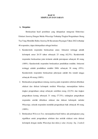 THE EFFECTIVENESS OF STUNTING EDUCATION WITH WHATSAPP MEDIA ON THE LEVEL OF KNOWLEDGE OF PARENTS WHO HAVE STUNTING CHILDREN UNDER FIVE IN PAYANGAN SUB DISTRICT IN 2022 ABSTRACT Stunting is a condition in which children under five have a length or height that is less than their age. One of the contributing factors is knowledge. This study aims to determine the effectiveness of stunting education with WhatsApp media on the level of knowledge of parents who have stunting children under five in Payangan sub district in 2022. This research used one group pretest-post test design and random sampling technique with 40 people as the sample. Knowledge data collection using a questionnaire. Statistical test using computerized, normality test using Shapiro-Wilk and nonparametric test using Wilcoxon Test (95% CI =0.05). The results obtained before the sample received stunting education, group discussions, and leaflet distribution, there were nine people (22,5%) who had sufficient knowledge and 31 people (77,5%) with less knowledge before the interventions in the form of education, group discussions, and leaflet distribution. Meanwhile after the interventions there were 40 people (100%) who had good knowledge. The result of the Wilcoxon Test is p value 0.000, it means that there is a significant increase in sample knowledge after education, group discussions, and leaflet distribution. Therefore, stunting education with WhatsApp media is effective on the level of knowledge of parents who have stunting children under five in Payangan sub district in 2022. Recommendations: it is expected that parents of children under five more actively seek information through health workers or electronic media and discussions with health workers via WhatsApp. Keywords: WhatsApp; parents of stunting children under five; stunting knowledge EFEKTIVITAS EDUKASI STUNTING DENGAN MEDIA WHATSAPP TERHADAP TINGKAT PENGETAHUAN ORANG TUA YANG MEMILIKI BALITA STUNTING DI KECAMATAN PAYANGAN TAHUN 2022 ABSTRAK Stunting adalah kondisi balita memiliki panjang atau tinggi badan yang kurang jika dibandingkan dengan umur. Salah satu faktor penyebabnya adalah pengetahuan. Penelitian ini bertujuan mengetahui efektivitas edukasi stunting dengan media WhatsApp terhadap tingkat pengetahuan orang tua yang memiliki balita stunting di kecamatan Payangan tahun 2022. Desain penelitian menggunakan one group pretest-post test. Pemilihan sampel menggunakan teknik random sampling dengan besar sampel 40 orang. Pengumpulan data pengetahuan menggunakan kuesioner. Uji statistik menggunakan komputerisasi, uji normalitas menggunakan Shapiro-Wilk dan uji nonparametrik menggunakan Wilcoxon Test (tingkat kepercayaan 95% α=0,05). Hasil penelitian didapatkan sebelum responden mendapatkan edukasi stunting, diskusi kelompok, dan pembagian leaflet, sampel memiliki pengetahuan cukup sebanyak sembilan orang (22,5%) dan pengetahuan kurang sebanyak 31 orang (77,5%), sedangkan setelah responden mendapatkan edukasi stunting, diskusi kelompok, dan pembagian leaflet, sampel memiliki pengetahuan baik sebanyak 40 orang (100%). Hasil Wilcoxon Test adalah p value 0,000 artinya ada peningkatan pengetahuan responden yang signifikan setelah edukasi, diskusi kelompok, dan pembagian leaflet, sehingga edukasi stunting dengan media WhatsApp efektif terhadap tingkat pengetahuan orang tua yang memiliki balita stunting di kecamatan Payangan tahun 2022. Saran: diharapkan orang tua balita lebih giat mencari informasi melalui petugas kesehatan ataupun media elektronik dan diskusi dengan petugas kesehatan melalui WhatsApp. Kata kunci: WhatsApp; orang tua balita stunting; pengetahuan stunting