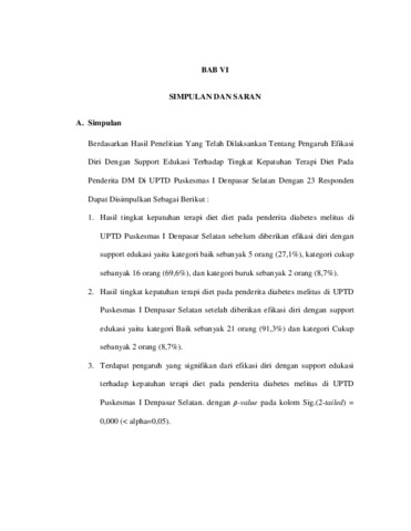 PENGARUH EFIKASI DIRI DENGAN SUPPORT EDUKASI TERHADAP TINGKAT KEPATUHAN TERAPI DIET PADA PENDERITA DM DI UPTD PUSKESMAS 1 DENPASAR SELATANPENGARUH EFIKASI DIRI DENGAN SUPPORT EDUKASI TERHADAP TINGKAT KEPATUHAN TERAPI DIET PADA PENDERITA DM DI UPTD PUSKESMAS 1 DENPASAR SELATAN